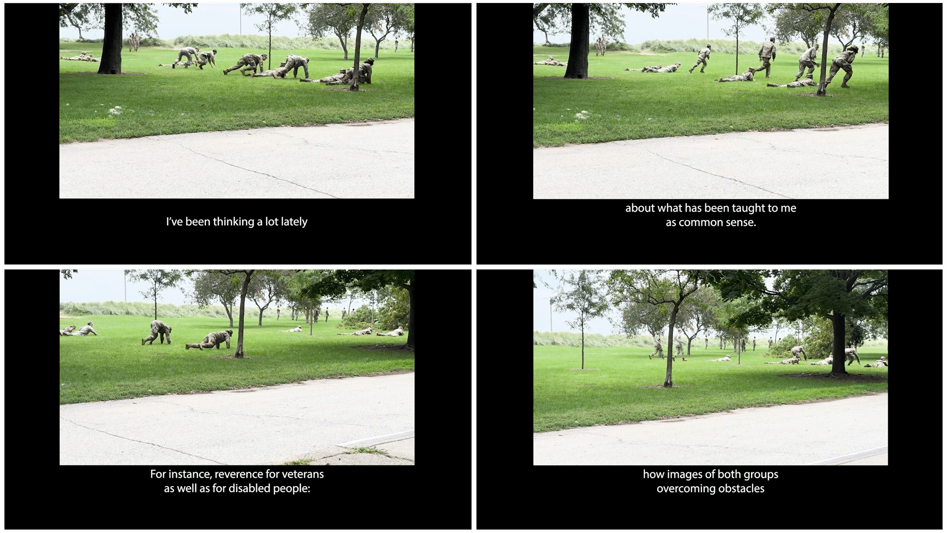 About halfway through An All-Around Feel Good, the screen shows a group of soldiers doing a training exercise in a public park. There is a gentle comedy here, of these men and women in full military apparel, running and jumping from (or toward) an imaginary threat (and, as the narrator wryly notes, “ostensibly trying not to be seen, although they are in a wide-open green space”). Over their images, Lord narrates, “I’ve been thinking a lot lately about what has been taught to me as common sense. For instance, reverence for veterans as well as for disabled people: how images of both groups overcoming obstacles are intended to make their audiences feel good.” As the scene continues, Lord plays the audio from two promotional videos for Veterans of Foreign Wars (VFW). Shortly thereafter, Lord will reference one of the most famous images of disability history in the United States: the Capitol Crawl of March 12, 1990, in which activists made their way up the stairs of the Capitol building, many with great physical difficulty. As Lord says in the film, “This created an image problem, which the nation-state sought to resolve by naming disabled people as Americans first.” The ADA was formally signed into law four months later. And so an interesting opposition subtly takes root—between the soldiers-in-training who crawl to avoid being seen, and the disability activists who crawled precisely in order to be seen.